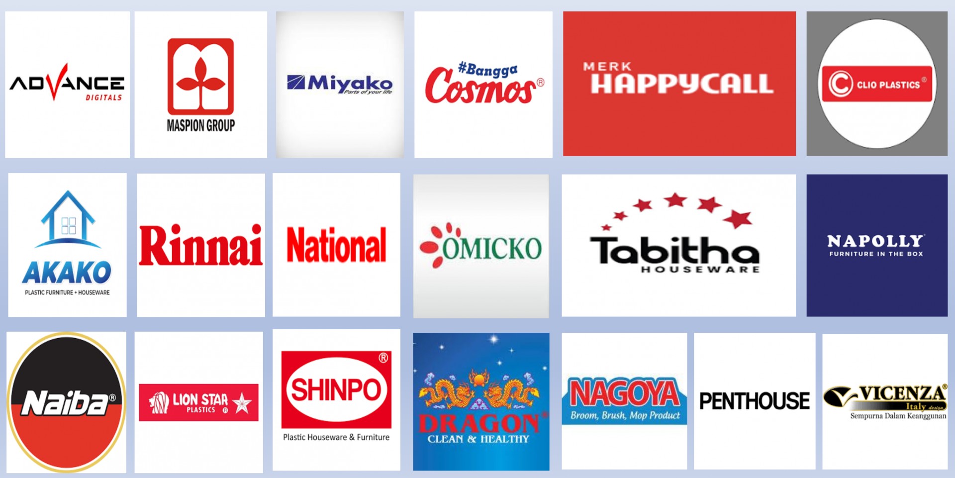 Advance, Maspion Group, Miyako, Cosmos, Happycall, Clio Plastics, Akako, Rinnai, National, Omicko, Tabitha, Napolly, Naiba, Lion Star, Shinpo, Dragon, Nagoya, PentHouse, Vicenza.